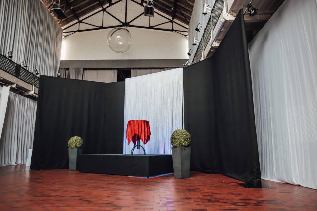 • Weiße und schwarze Vorhänge (Drapes) mit jeweils über 100 m Gesamtlänge – schwer entfammbar (B1-Zertifiziert).
